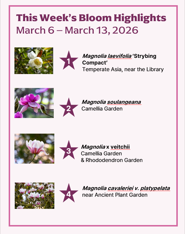 Use the Magnificent Magnolia Map to explore different Magnolia Exploration Zones throughout the Botanical Garden. Large versions of this map will be on display onsite and updated each week with highlighted blooms to discover!